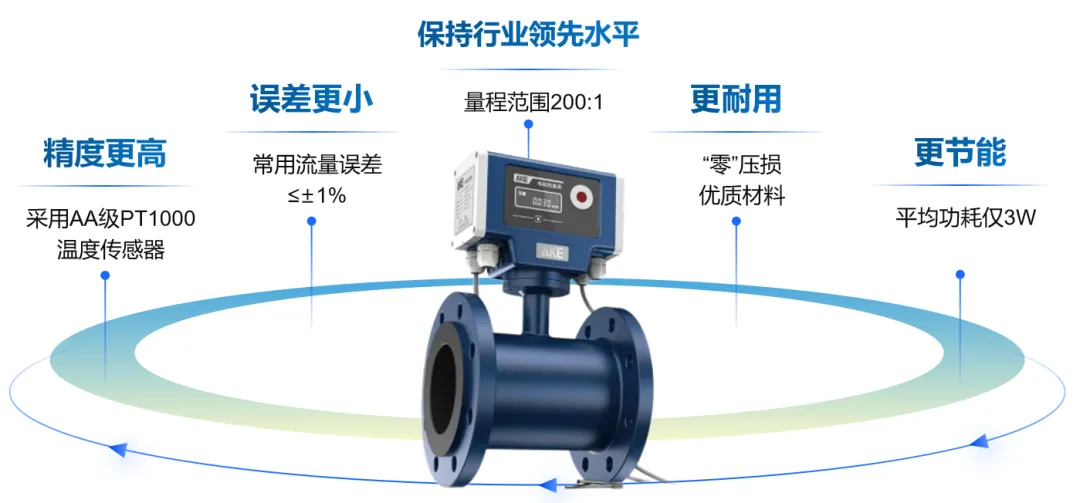 创新采用AA级精度的PT1000温度传感器,先进的流量检测算法技术,具备精度高、误差小、功耗低等特点,可配合查询面板、移动端、软件平台实现三显三控,一键高效运维。
