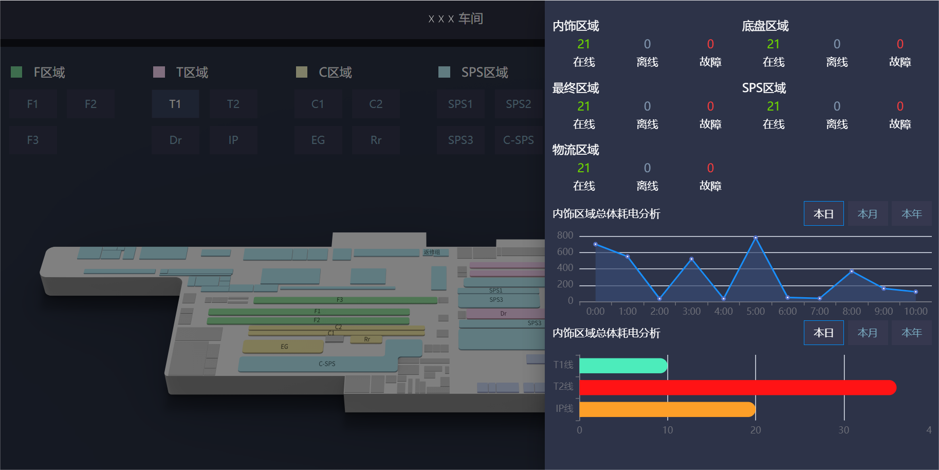 对工厂办公楼、厂房、生产区域进行照明设备的场景化监控,并能监测各区域、各灯具的工作状态;满足车间、区域、产线、工艺段的生产区域精细化照明应用管理,实现集中管理、定时控制、应急手动控制、场景控制等功能,达到按需照明、节能管理的目标。
