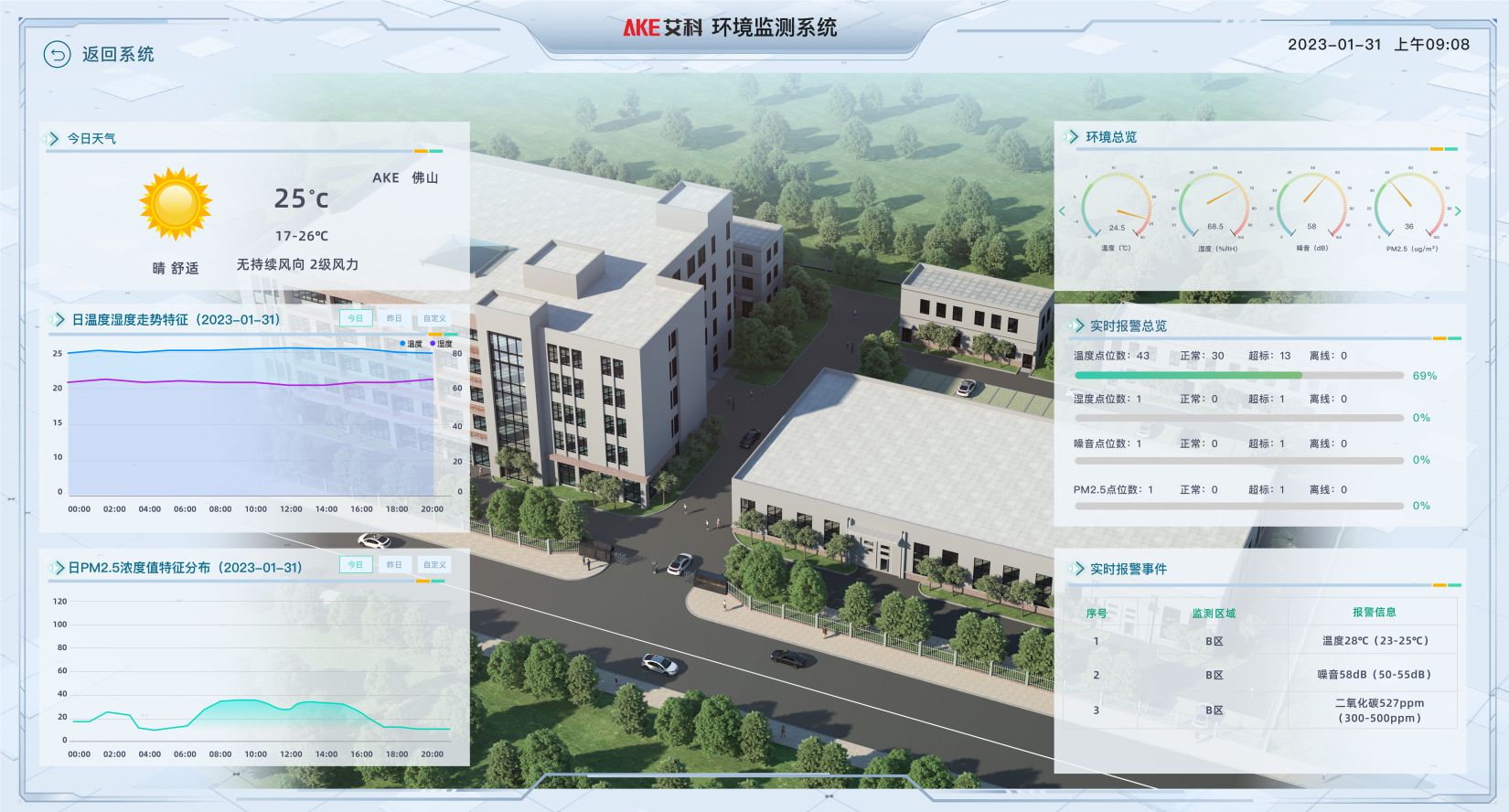 对工厂车间的温湿度,生产线的废气、烟气等环境参数进行集中监视与预警,平台可根据选择的时间、区域自动生成温湿度曲线图、环境参数对比图等可视化图表