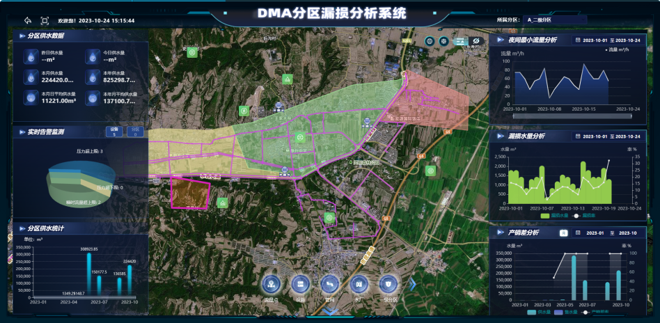 01、DMA总览大屏:用户通过基于GIS实现的分区可视化总览大屏可快速、直观地了解水司的各个分区和管道的实时状况和水量指标,方便管理者掌握总体及异常情况,快速做出决策,提高管理效率。