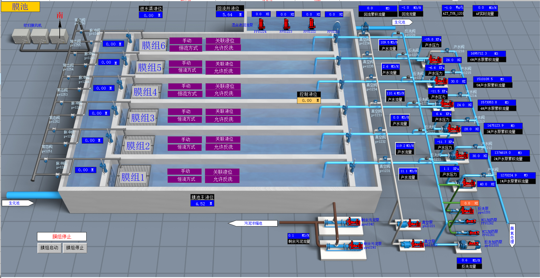 项目通过对主控系统PLC控制站、滤池系统PLC控制站、加药系统PLC控制站、膜系统PLC控制站进行自动化改造建设,实现实时采集生产数据和设备实时运行工况,控制相关的生产环节,及时处理生产过程中的故障,提高污水处理效率、降低运行管理成本,保证污水处理厂长期安全无故障运行。